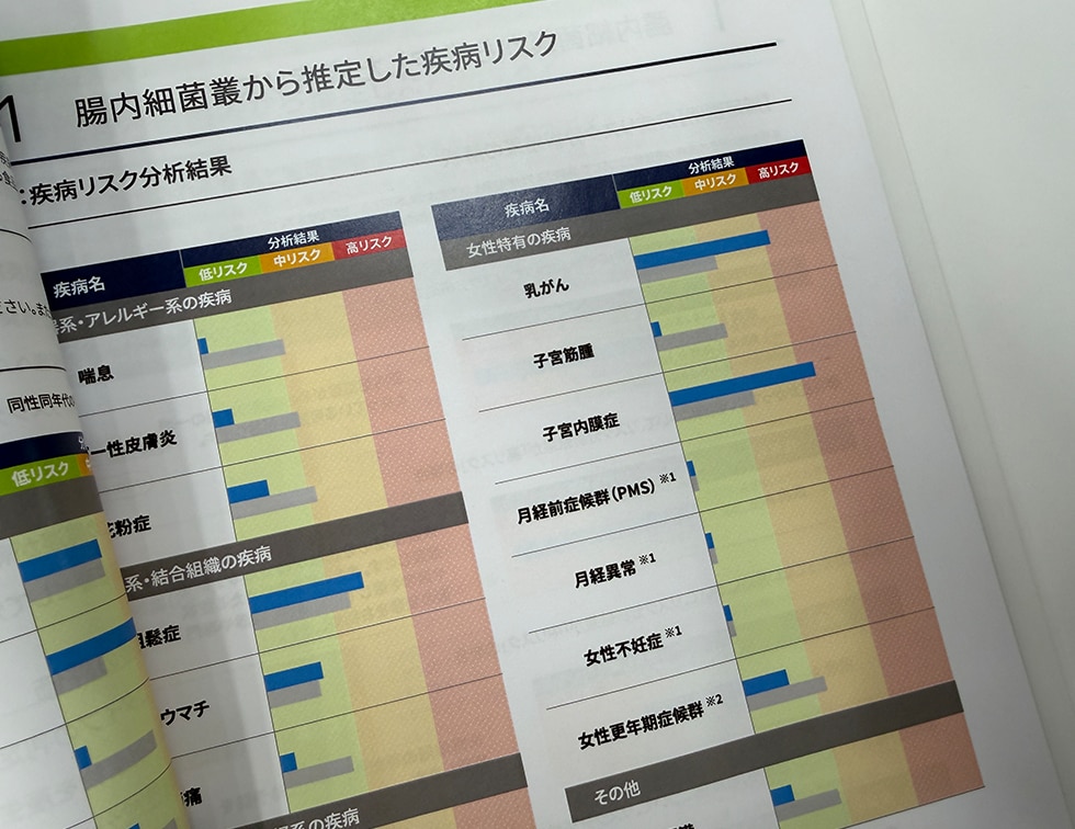 ▲実際のレポート:「乳がん」「子宮内膜症」の「高リスク」が目立っている